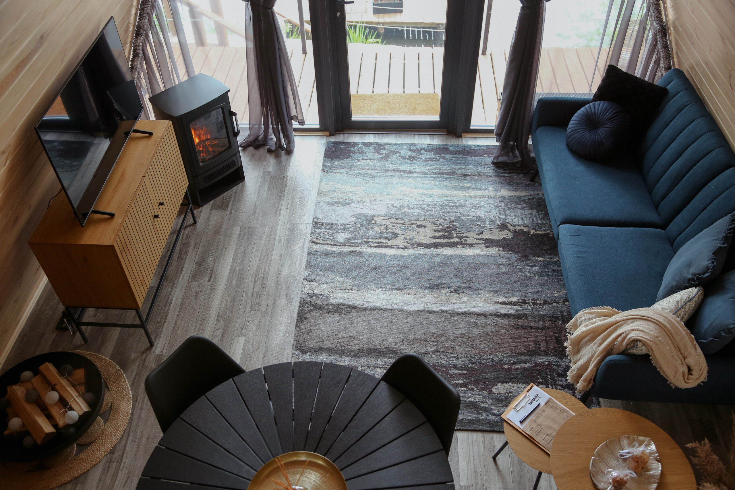 - панорамні вікна забезпечують м’яке природне освітлення, створюють ефект єднання з природою — можна насолоджуватися заходом сонця, зоряним небом, красою озера чи засніженим лісом, не виходячи з теплого котеджу;