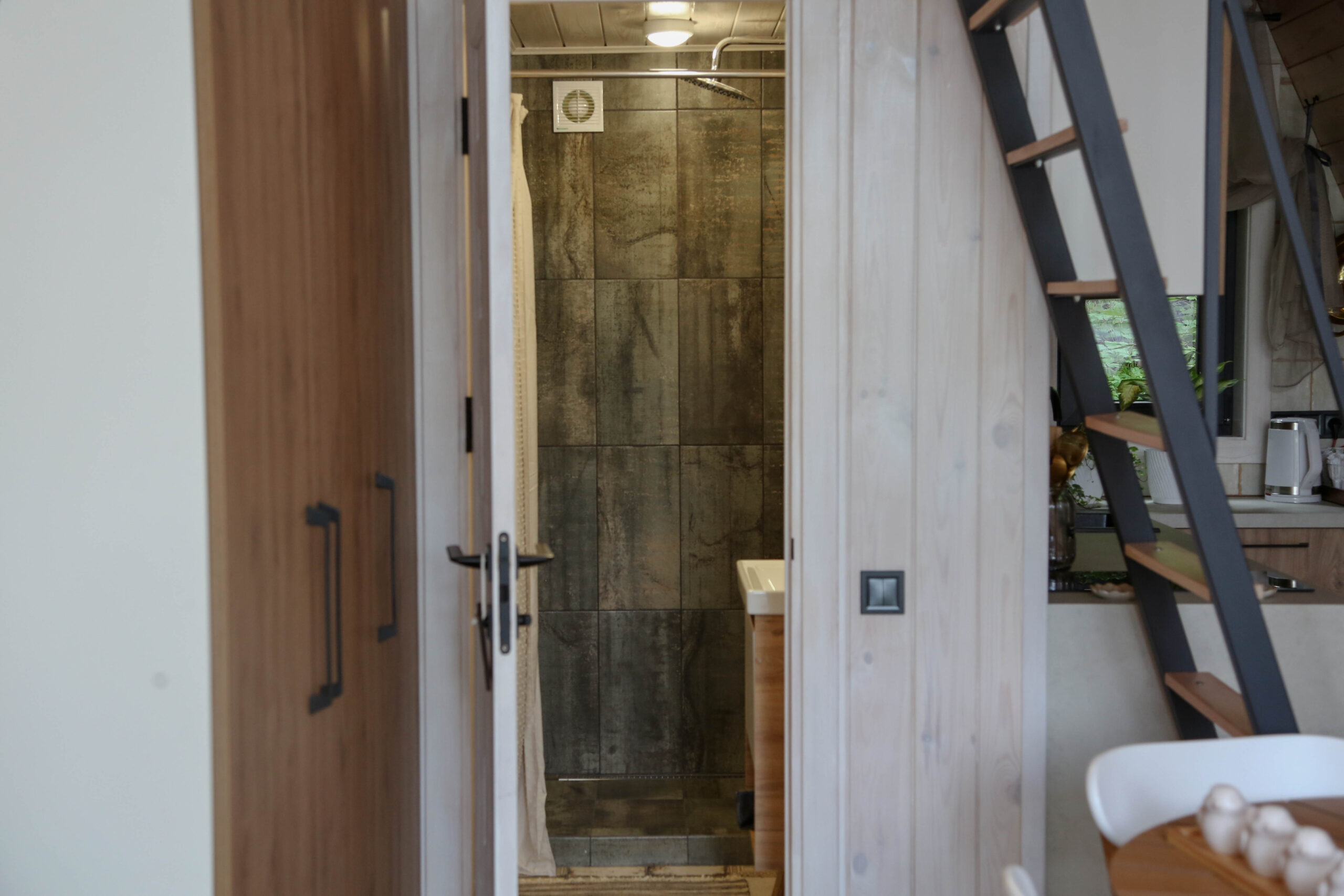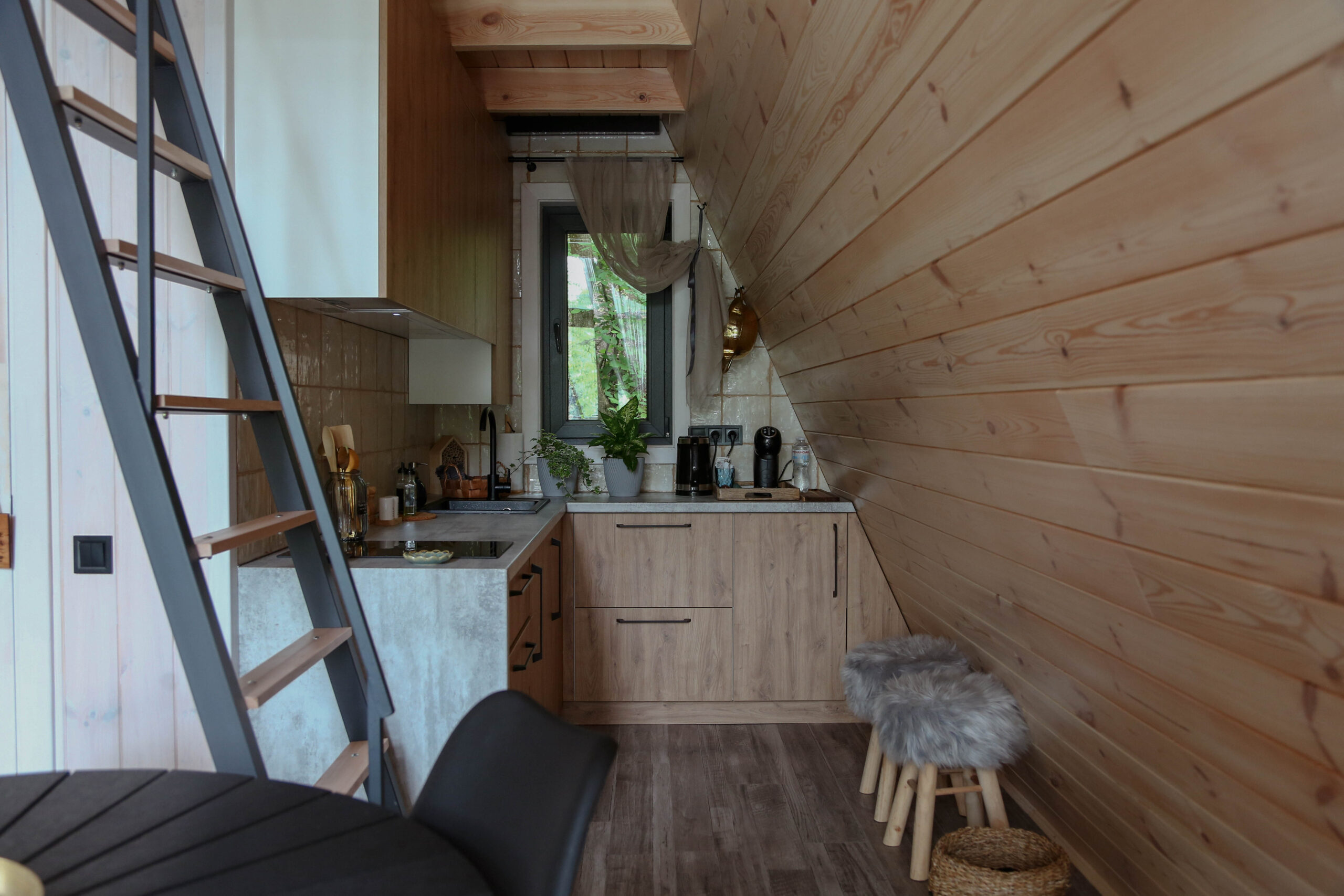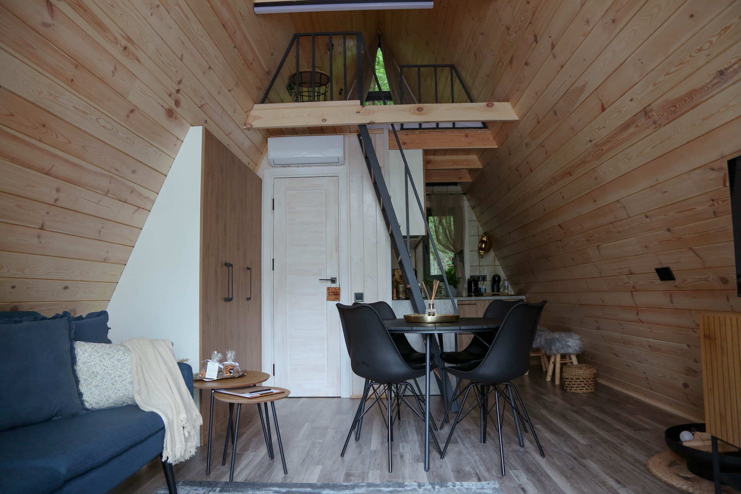 - Всередині – кімната-студія в якій є диван-софа та двоспальне ліжко на горищі, а також кухня та душ.