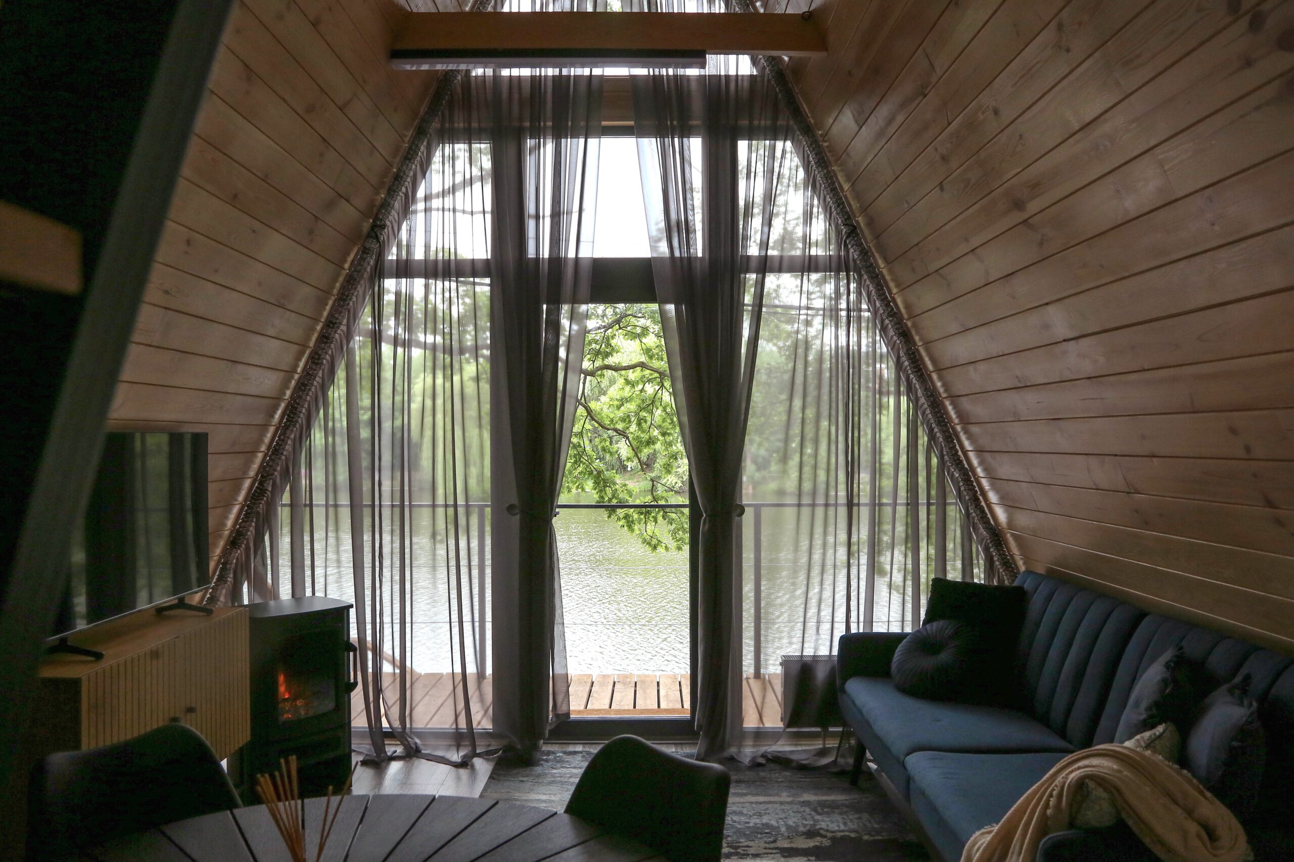 Наш А-фрейм — будинок для відпочинку, який ідеально підійде для романтичних вихідних удвох або ж вікенду в сімейному колі. Всередині помешкання є сучасна техніка, зручні меблі, освітлення, санвузол готельного типу з необхідними засобами гігієни, посуд і кухонна техніка — словом, усе, щоб відпочити з комфортом. Біля будиночка озеро та власний пірс, також тераса з шезлонгами та мангальна зона.