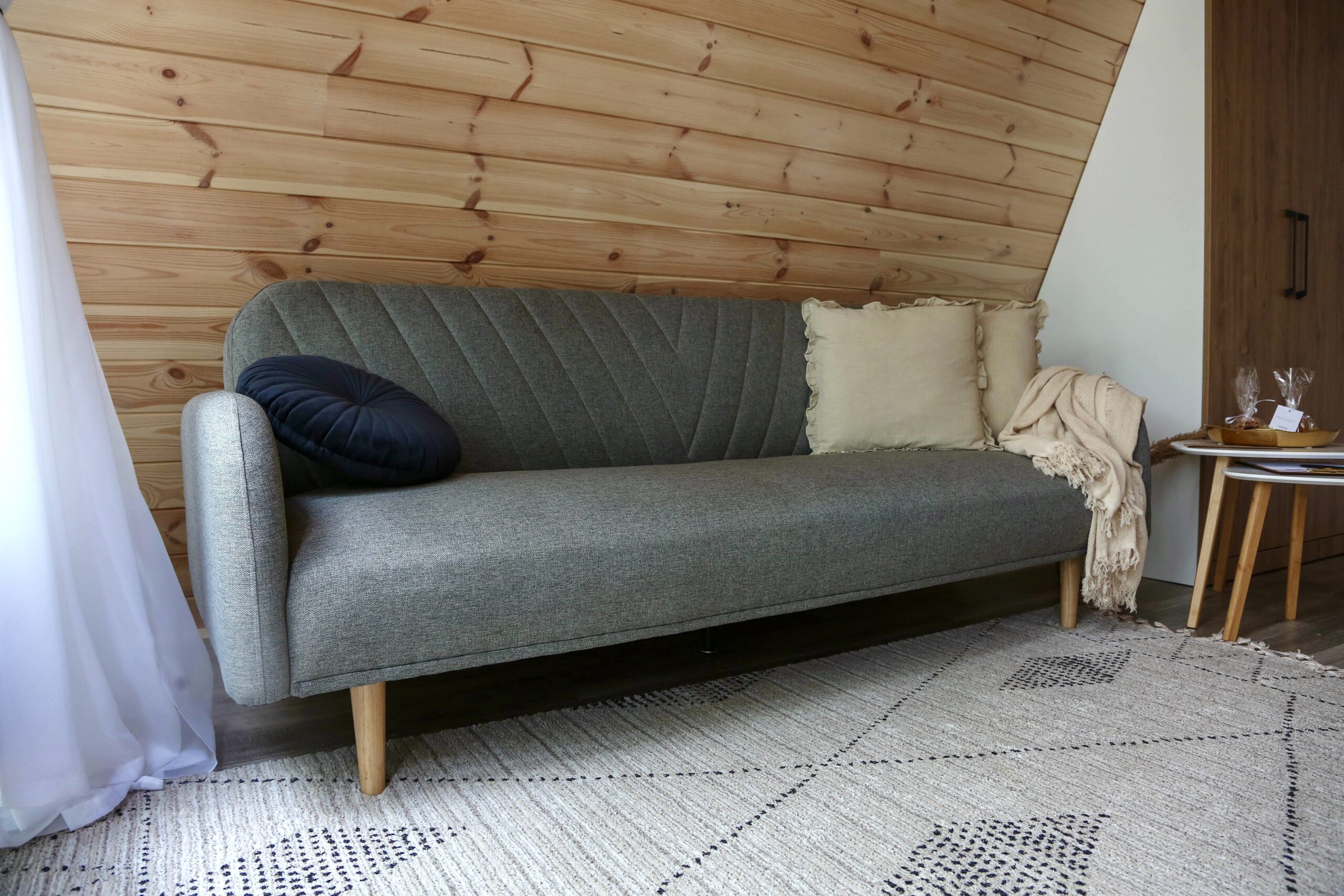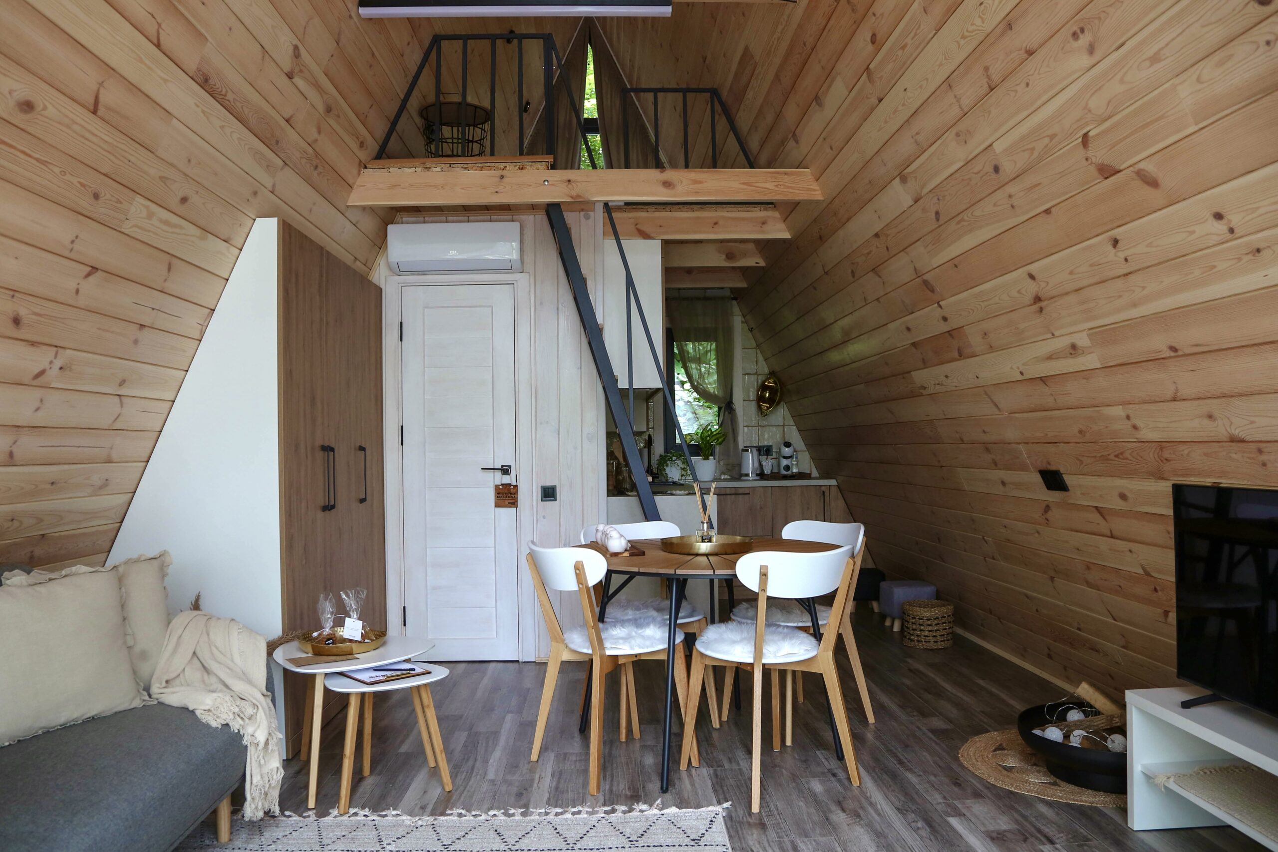 - Всередині – кімната-студія в якій є диван-софа та двоспальне ліжко на горищі, а також кухня та душ.